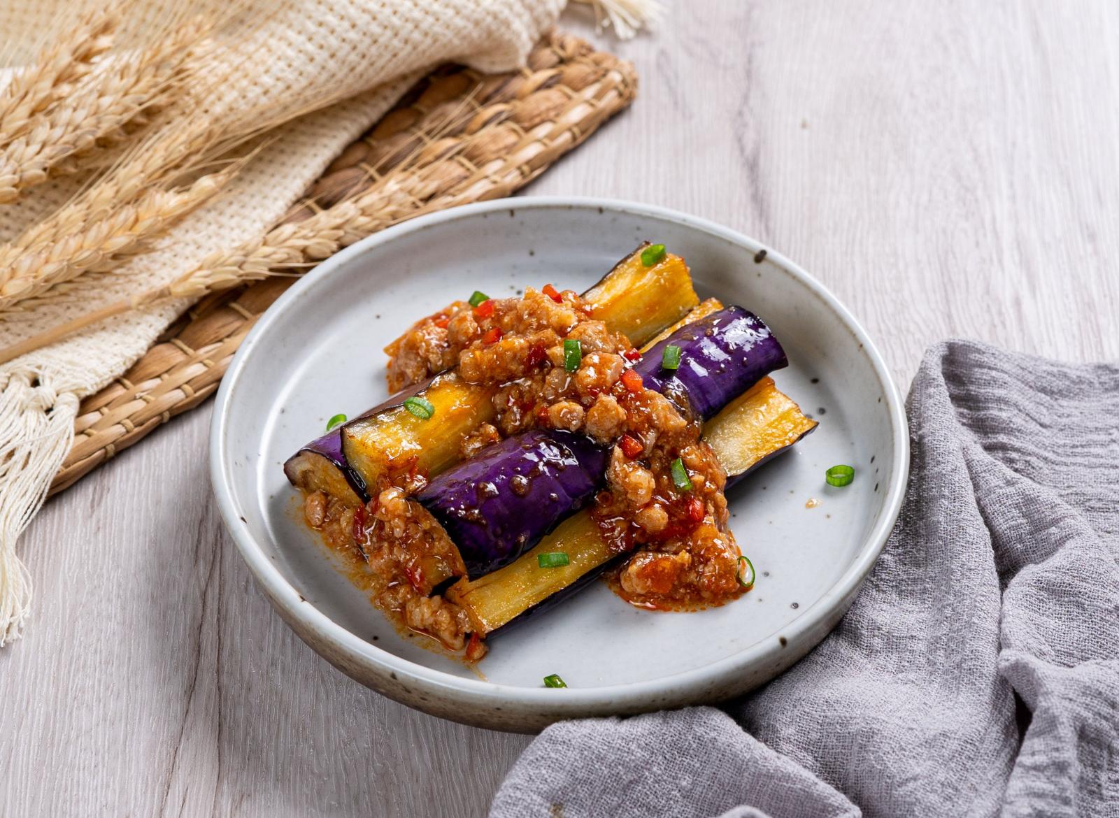● 材料:茄子500公克、絞肉40公克、蔥1根、薑15公克、蒜頭 20公克