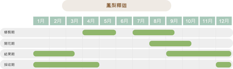 鳳梨釋迦依氣候情況及栽培環境不同,果實發育時間為140-160天不等,田間採收之判斷標準為果皮顏色由綠色轉黃綠色,突起之鱗目較平順後,即可剪下採收。