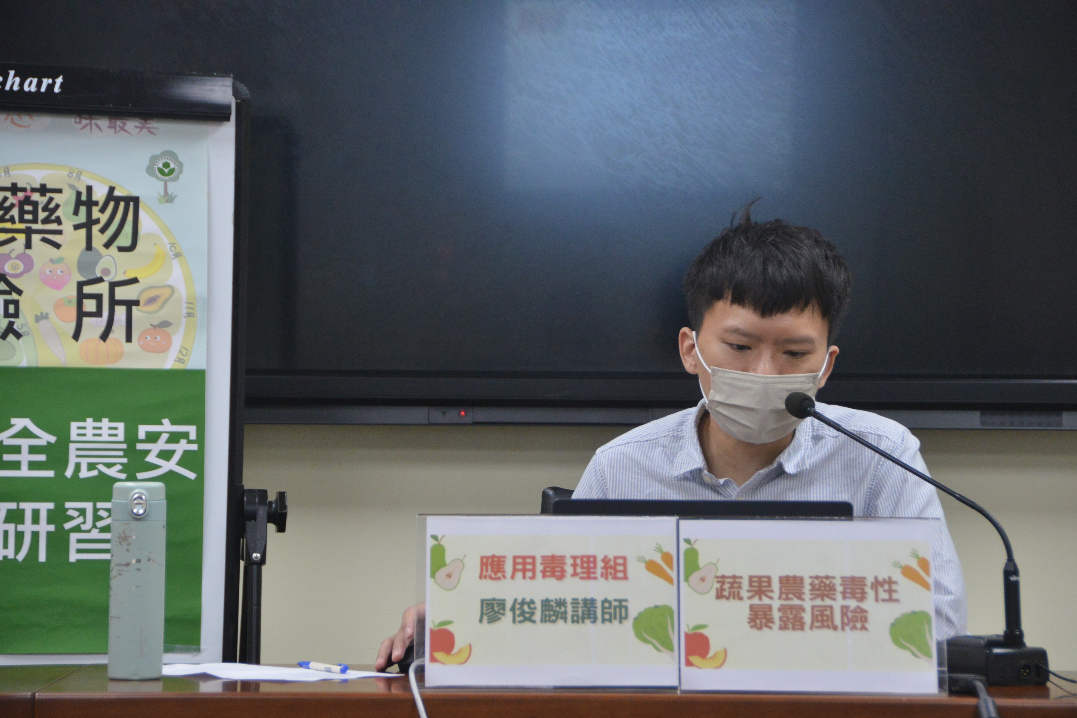 在「蔬果農藥毒性暴露風險」課程中,應用毒理組廖俊麟講師 以深入淺出的方式說明農藥風險評估的科學依據,舉例說明「食鹽相對風險」與「每日容許攝取量(ADI)」的概念,協助學員正確認識「劑量決定毒性」的基本原理。