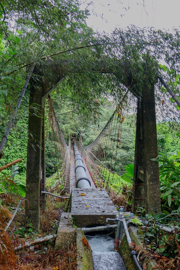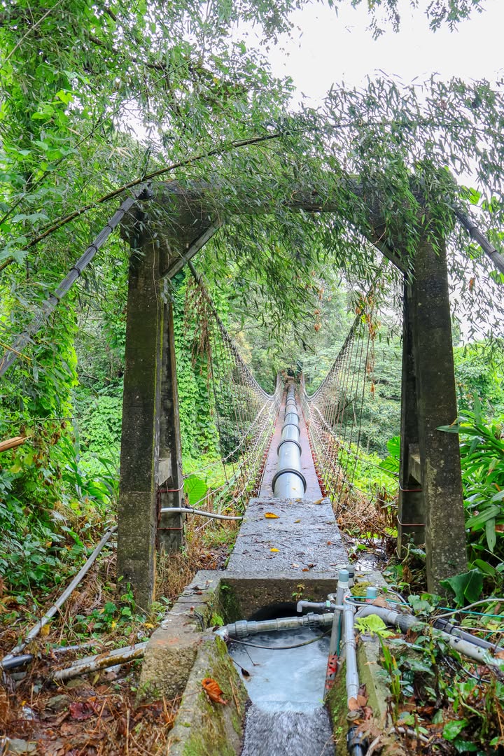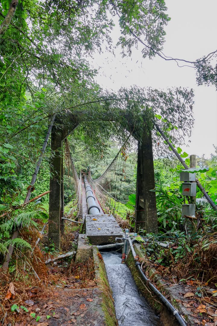 過水吊橋為 #懸索吊橋,橫跨矮山溪,主要承載管徑約400mm之通水管,屬灌溉用之水利工程,吊橋二側各有73根吊索,下端連結了懸吊梁,兩端各有一鋼筋混凝土構造之橋塔支撐主纜索💪