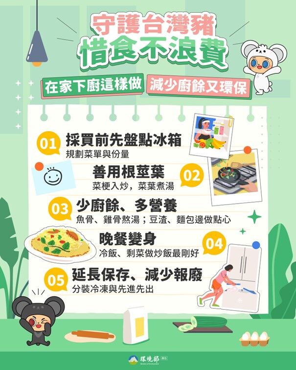 環保局表示把握以上原則,能把食物價值最大化,並響應惜食也減少食物浪費與廚餘,進而能減少碳排放,共同邁向2050淨零轉型目標。而在非洲豬瘟防疫期間,減少廚餘更是全民防疫、守護臺灣豬的重要關鍵!讓我們用最簡單的方式共同守護地球環境與臺灣。