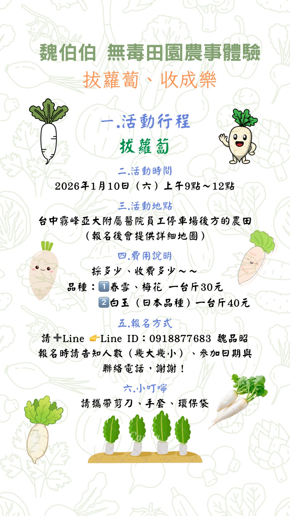 魏伯伯無毒田園農事體驗|拔蘿蔔、收成樂 資料來源農村發展及水土保持署 體驗冬季小農的幸福時光! 冬天是蘿蔔最甜美的季節!快一起走進田間,親手「拔」出大地的驚喜吧! 透過親身體驗,感受泥土的香氣與豐收的喜悅,看看誰能拔出最大顆的白胖蘿蔔~ 無論是親子假日出遊、朋友團體同樂,或是戀人約會,都能在這片田園裡找到專屬的「收成樂」。 一起動手拔出幸福的滋味吧! 相關照片 S__321339639_0 活動日期115-01-10~115-01-10 縣市臺中市 活動類別 農漁牧體驗 地產地消 農業類別 休閒 六大方針 支持認同在地農業 對外連結