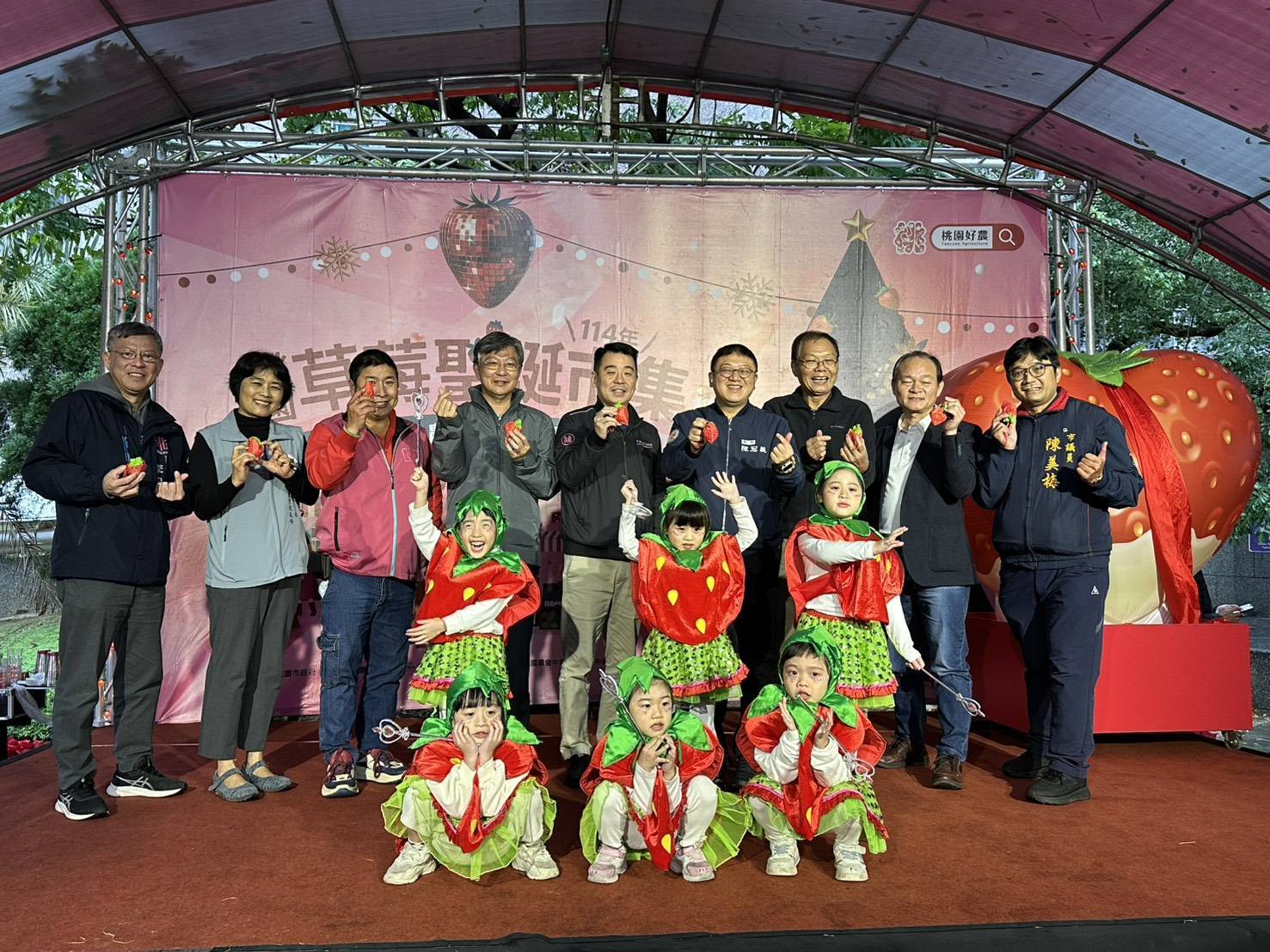 「114年桃園草莓食農聖誕市集」今(25)日於中壢銀河廣場熱鬧登場,活動將連辦4天持續至28日,桃園市副秘書長金志聿出席開幕活動,公布全新桃園市草莓農場地圖,亦同步舉辦「草莓氣泡飲」新品發表;透過闖關活動、食農體驗及桃園好農市集展售等,來推廣桃園草莓產業及食農教育。