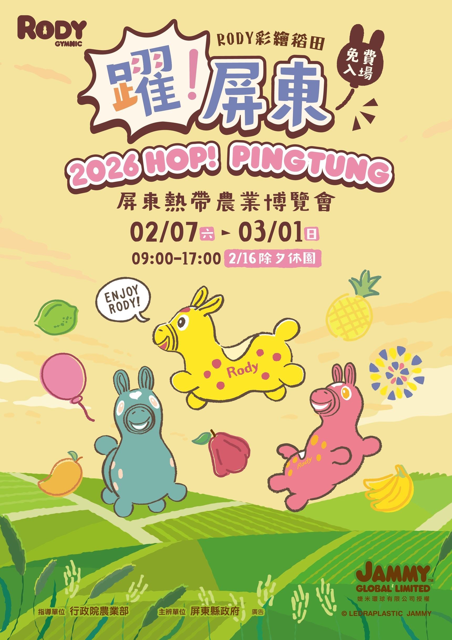今年熱博以「2026 躍!屏東(HOP!PINGTUNG)」為主題,融合屏東熱帶農業的豐富能量,並與國際知名童趣角色跳跳馬RODY 共同展現馬年意象,打造充滿躍動感與活力的節慶氛圍。活動現場規劃跳跳馬RODY 彩繪稻田、三座跳跳馬 RODY 迎賓裝置、瓜果長廊及多元特色展區,誠摯邀請全國民眾於新春期間走訪屏東,一同感受熱情洋溢、動感十足的熱博魅力。