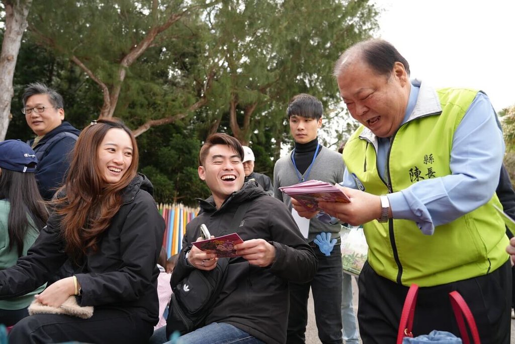 2026澎湖縣冬日花海遊樂園「花現新澎友」今天開幕活動,由澎湖縣長陳光復、農漁局長陳高樑等人到場,與近1000名親子同遊花海及市集,並發送「馬上有錢」、「大吉大利」春聯。