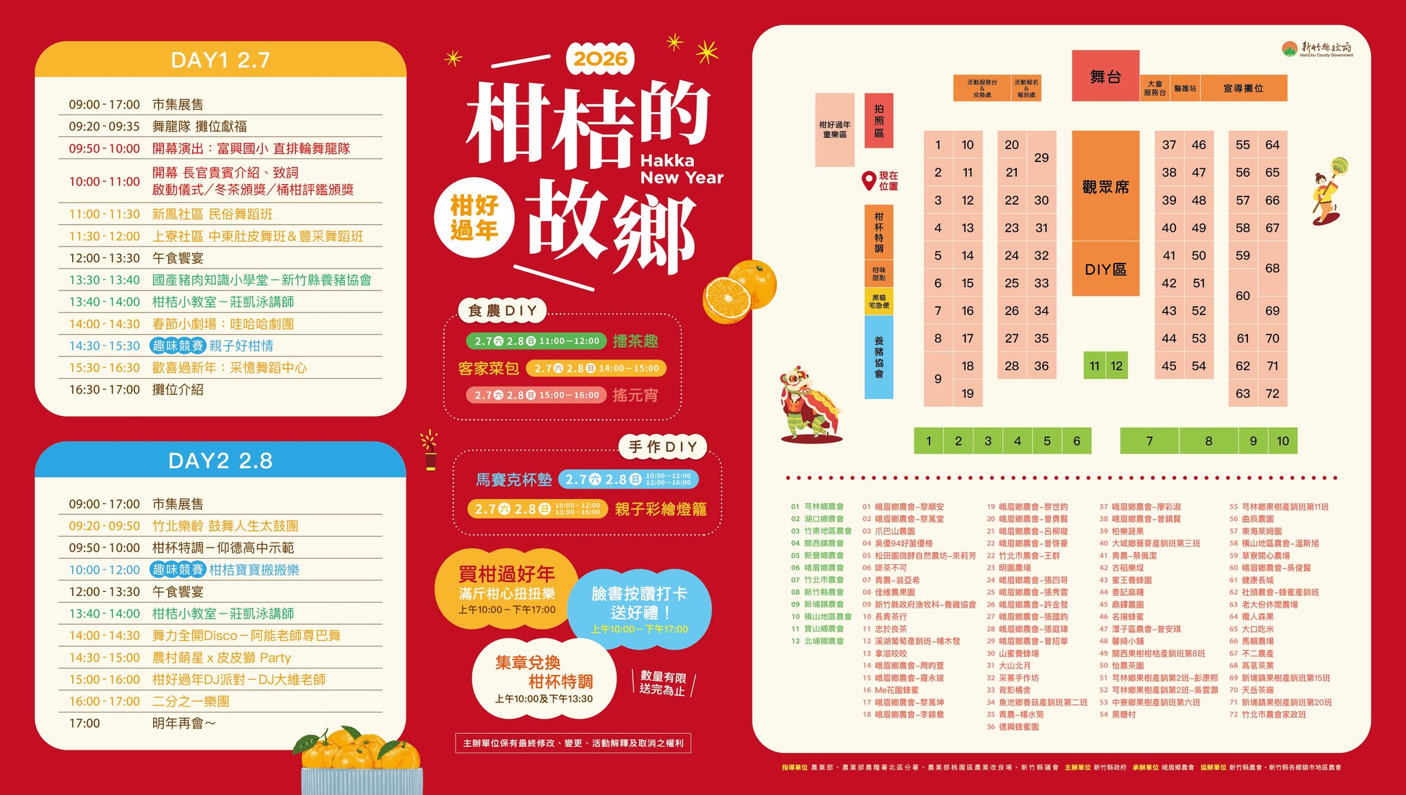 活動現場集結在地柑桔攤位、農會及特色農產展售,並安排迎春舞龍、傳統手作體驗、趣味競賽、DJ派對及「農村萌星 x 皮皮獅 Party」等節目,