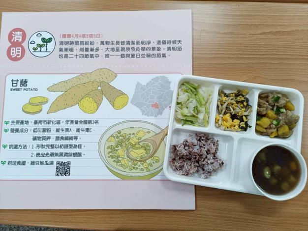 永康國小營養師王瓊嫣表示,地瓜不僅是臺南新化區的農特產,也是清明節氣具代表性的食材,擁有香甜滋味且富含膳食纖維,有助於維持腸道健康。當日課程結合農場資源進行地瓜蛋糕手作體驗,午餐時間也推出地瓜粉蒸雞及地瓜圓甜湯等料理,讓學生在學習烹飪技巧的同時,也能品嚐健康美味的在地料理。