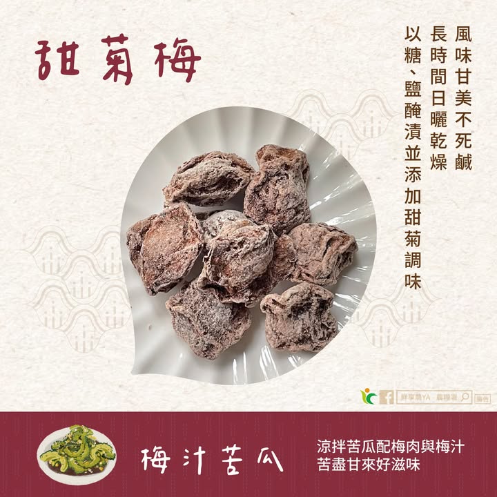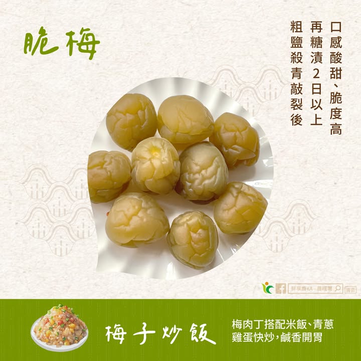 梅好料理~經典再現✨ 發布日期114-03-21 資料來源農糧署 更新日期115-04-20 #梅子 產地分佈於高雄、南投,臺東、臺南等 每年3月下旬至5月中旬為主要採收產季 鮮果脆硬酸澀,需加工後食用 依梅子的熟度,使用不同調味及加工方式 呈現各式風味梅子🤤 你喜歡梅子嗎?🥰 喜歡梅子料理嗎?😍 點開圖卡一起來看看【梅好料理】吧👇 梅子 料理 脆梅 烏梅 甜菊梅 紫蘇梅 相關照片 經典再現 梅好料理 脆梅 烏梅 甜菊梅 紫蘇梅 三面六項 飲食消費與生活 飲食文化 對象 國小低年級 國小中年級 國小高年級 國中 高中職 大專以上 成人 樂齡 六大方針 傳承與創新飲食文化 深化飲食連結農業 知識類型圖卡/海報 對外連結