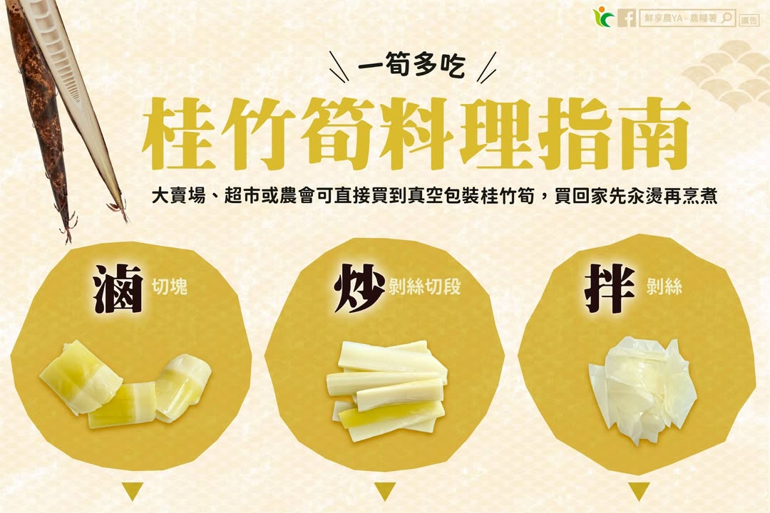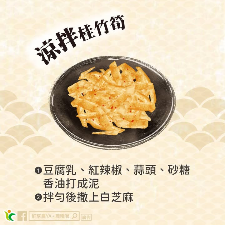 ✨✨桂竹筍料理指南 發布日期114-05-16 資料來源農糧署 更新日期115-04-24 教你「桂竹筍」料理指南😋 四月開始 是品嚐 #桂竹筍 的好時節 桂竹筍以北部為主要產地 因其產期短、不耐久放 一般會在採收後蒸煮,保留鮮甜脆嫩口感 也可於大賣場、超市或農會直接購買真空包裝桂竹筍 料理起來快速又方便喔👌 桂竹筍口感爽脆鮮甜,高纖又低熱量 適合滷、炒、涼拌及煮湯料理 跟著圖卡介紹,一起動手變出三道好菜吧👇 🔹梅乾菜桂竹筍|鹹香入味、超下飯 🔸醬香桂竹筍|清炒提鮮,簡單就美味 🔹涼拌桂竹筍|夏日開胃首選,香辣爽口又解膩 桂竹筍 料理 滷 炒 拌 食譜圖卡 桂竹筍料理指南 梅乾菜桂竹筍 醬香桂竹筍 涼拌桂竹筍 下一篇蘆筍料理有訣竅 主要食材 蔬菜類 食譜類型 圖卡 對外連結