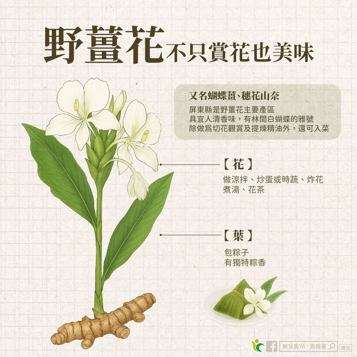 野薑花不只賞花也美味 發布日期114-08-28 資料來源農糧署 更新日期115-04-20 帶你認識「野薑花」的小秘密✨✨ 夏秋季是 #野薑花 盛開的季節 白色花朵如林間飛舞的蝴蝶🦋 更散發著淡雅的清香 野薑花除能做為觀賞切花、提煉精油 不同部位還可以入菜做成美味佳餚喔😋 ✔️ 「花朵」可製作沙拉、涼拌、炒菜或煮湯 ✔️ 「葉片」自帶香氣,是天然的粽葉材料 趁野薑花開之際,來場味覺的驚喜之旅 品嚐一口「花香入菜」的夏日滋味吧🙌 📍你吃過哪些野薑花料理? 野薑花 相關照片 野薑花不只賞花也美味 三面六項 農業生產與安全 飲食文化 對象 國小低年級 國小中年級 國小高年級 國中 高中職 大專以上 成人 樂齡 六大方針 支持認同在地農業 深化飲食連結農業 知識類型圖卡/海報 對外連結