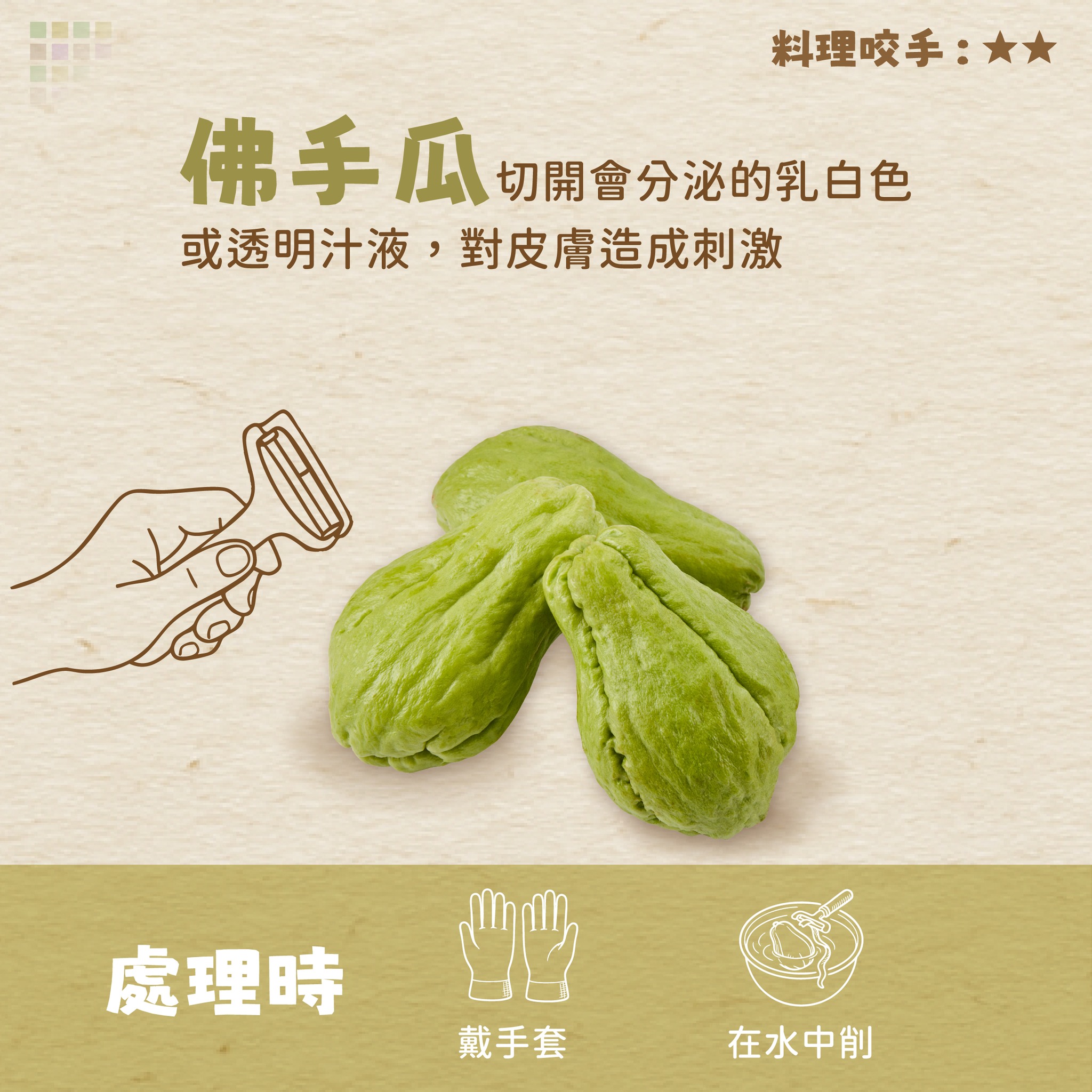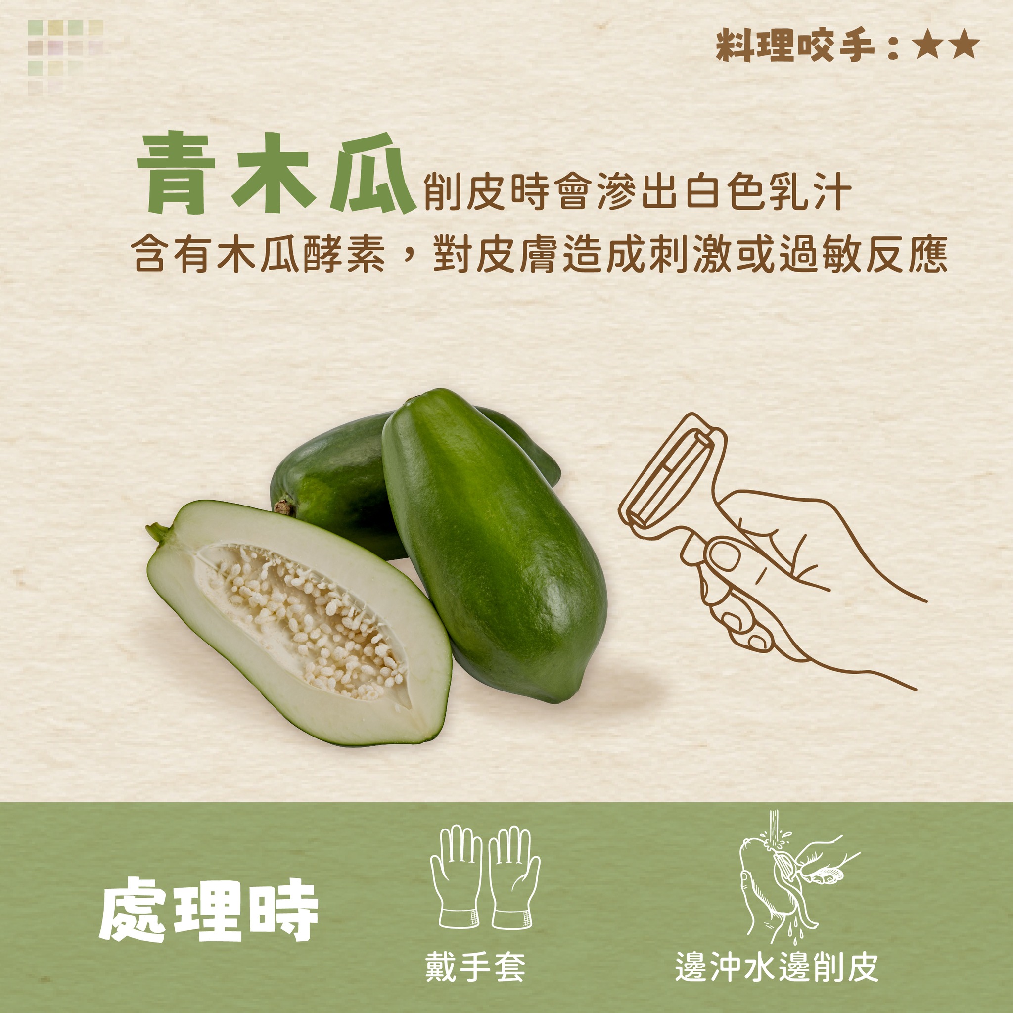 🙋大家在削皮時有被咬手的經驗嗎!? 發布日期115-01-14 資料來源農糧署 更新日期115-01-26 #削皮不手癢~準備好就不怕!💪 有些作物在削皮時接觸的手部會發癢 主要是因為植物的乳汁或黏液的成分刺激皮膚 如植木瓜酵素、蛋白質、活性成分或草酸鈣晶體 容易引起皮膚過敏反應,造成搔癢、紅腫等症狀 建議處理前帶上手套再行削皮 避免直接接觸 相關過敏物質在煮熟後便會破壞 因此務必充分烹煮、再行食用 ⚠️削皮的過程中如有嚴重過敏反應請盡速就醫 小編整理了四種作物以及處理秘訣 一起來看看吧😘 削皮 癢 相關照片 準備好就不怕 削皮不咬手 青木瓜 佛手瓜 芋頭 山藥 三面六項 農業生產與安全 農業與環境 對象 國小低年級 國小中年級 國小高年級 國中 高中職 大專以上 成人 樂齡 六大方針 支持認同在地農業 地產地消永續農業 知識類型圖卡/海報 對外連結
